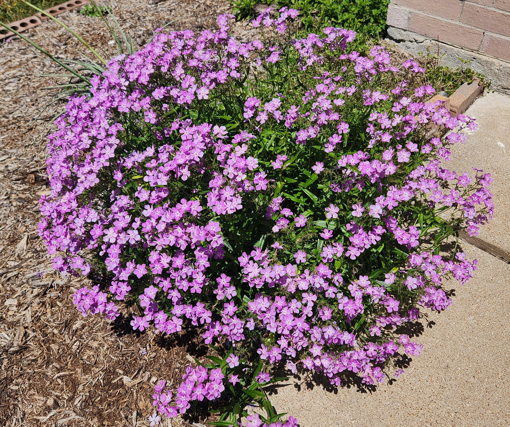 Prairie Phlox does well in dry to moderately moist, well-draining soil in full sun or part sun. It is not picky about soil type, thriving in loam, clay, sand or rock. Under stress, the lower leaves turn yellow and drop off. It appreciates a summer mulch which helps keep the root zone cool.