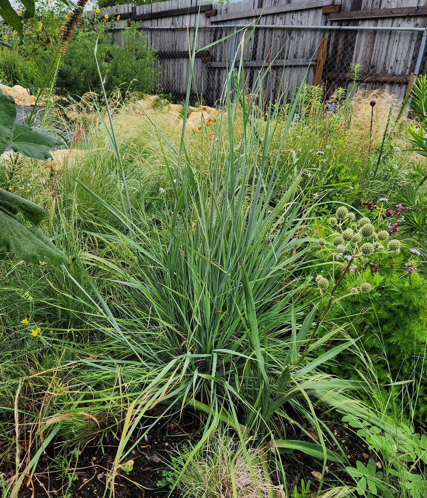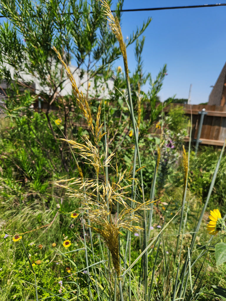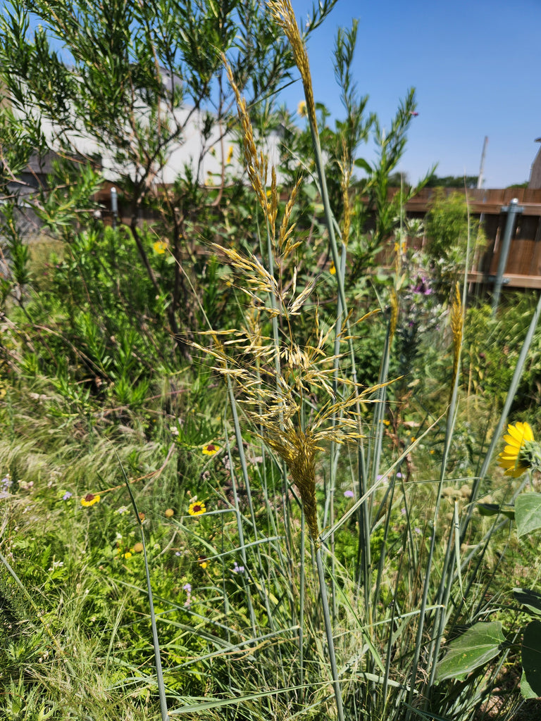 Indiangrass is a tall, perennial bunch grass. It reaches 3-5 feet and stays about 1-2 feet wide. This attractive grass forms stunning golden plume-like seed heads in the fall that mature September to November. It stays low most of the year until it starts blooming in the fall.