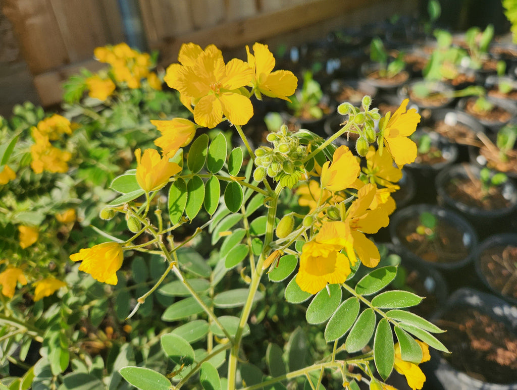Lindheimer Senna is an erect, bushy perennial with yellow blooms. It grows in sun or part shade, in shallow limestone soil, on hillsides or dry, rocky fields. Its leaves are gray, thick and have a velvety texture. It is effective in a wildflower garden as either a specimen, or background plant. Birds and other wildlife eat the seeds.