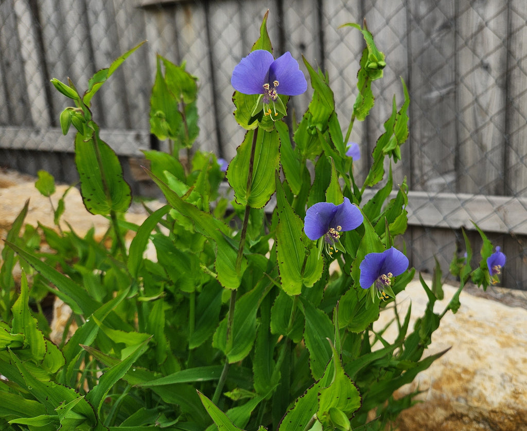 False Dayflower is an erect annual that is related to commelinas and spiderworts. It features purple flowers. Its grass-like leaves emerge in the fall and remain green through the winter months. It grows rapidly in early spring and blooms mid-spring, attracting bumblebees. A few weeks later, its seeds draw squirrels and turkeys. This entire cycle is usually completed by summer, when the plant has usually turned yellow and limp.